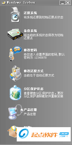 1、还原系统打开WindowsIcebox的设置程序,点击[还原系统]功能,将弹出恢复系统提示按钮,点击[确定]按钮,计算机将会重新启动并将系统恢复到初始还原点状态。