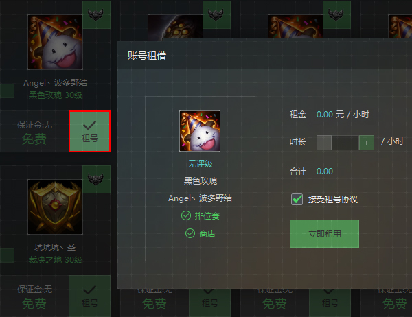 点击租号按钮,弹出账号租借面板,在这里选择您要租用该账号的时长,系统会计算出所需支付的费用,如果您的账户内余额不足,需要跳转前去充值。