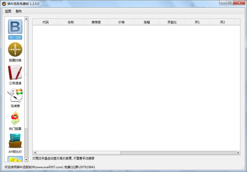 蜗牛选股免费版是一款非常实用的股票分析软件,该款软件界面整洁、操作简单,包含了竞价选股、强弱股扫描、公司公告查询、龙虎榜查询、股票日K浏览、热门股票查询、AH股票比价等功能。