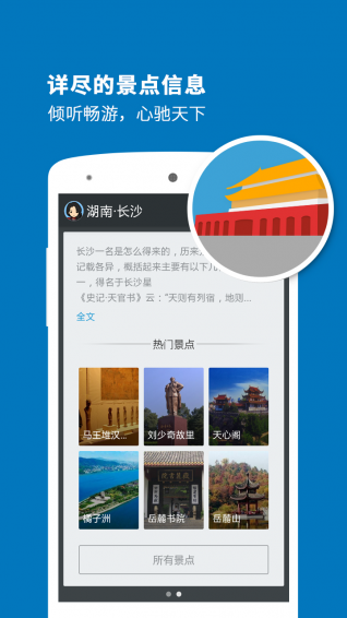 长沙导游app,智能语音导游系统,携手科大讯飞,带给您独特的长沙印象。“长沙”之名最早见于3000多年以前的西周。是楚文明和湘楚文化的发源地,我国历史上唯一经历三千年历史城址不变的城市,有文字可考的历史3000多年,因屈原和贾谊的影响而被称为“屈贾之乡”。长沙又称“楚汉名城”,马王堆汉墓和走马楼简牍等重要文物的出土反映其深厚的楚文化以及湖湘文化底蕴,位于岳麓山下的岳麓书院为湖南文化教育的象征。长沙曾作为楚之重镇、秦之名郡、汉之国都.....历史上涌现众多名人,留下众多的历史文化遗迹。