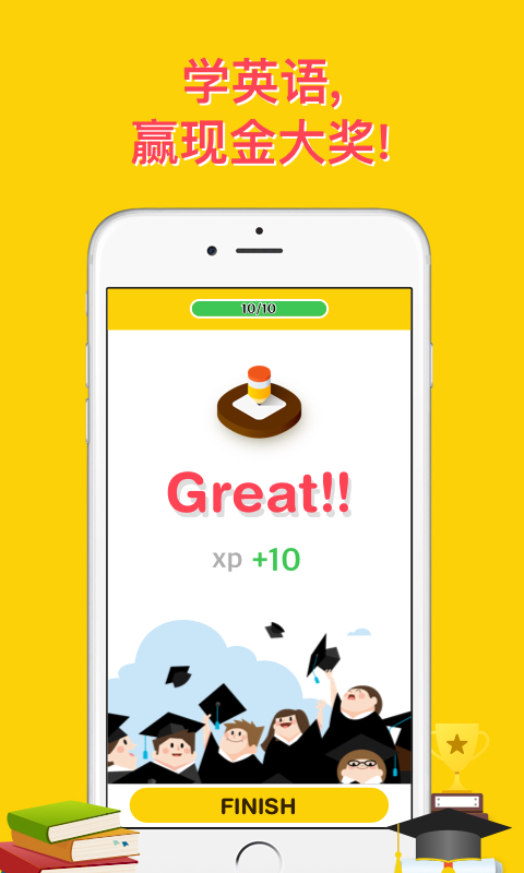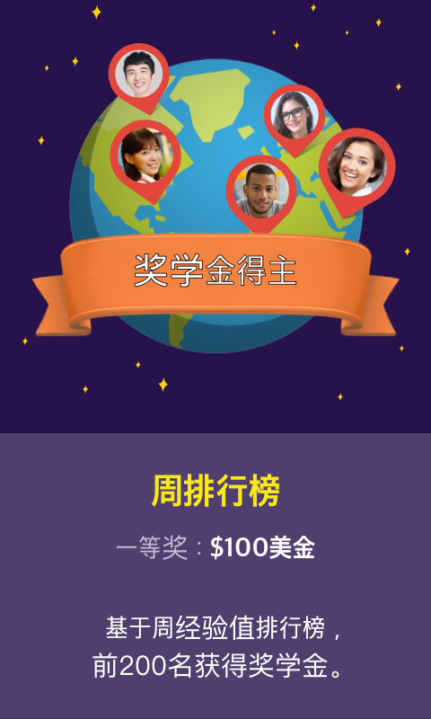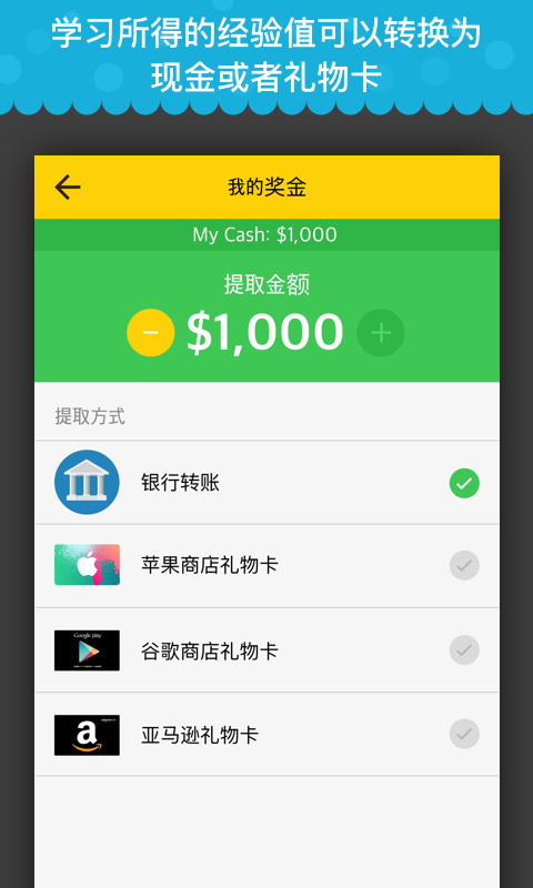 通过学习英语课程获取经验值。而经验值的高低是您赢取现金大奖的为一衡量标准!赢得的现金可以立即提现到您的银行账户或者转换成现金购物券。