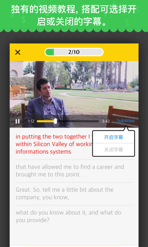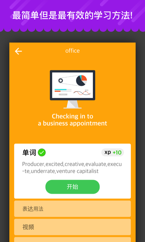 通过赢取经验值来解锁更多课程。用世界知名企业家的采访视频做教材,跟真正的商业精英学习商务英语!