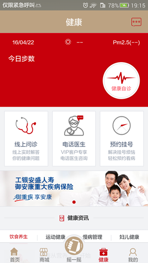 健康管理:为您提供健康资讯、线上问诊、电话医生、预约挂号、每日步数等服务,让您时时关注自身健康。