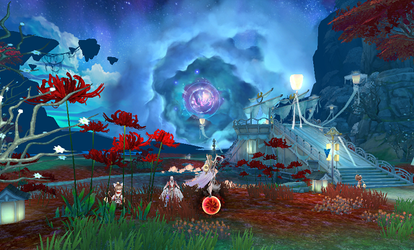 以一条忘川为界限,两边开满了彼岸花。花的周围有光斑状的蝴蝶和萤火虫。