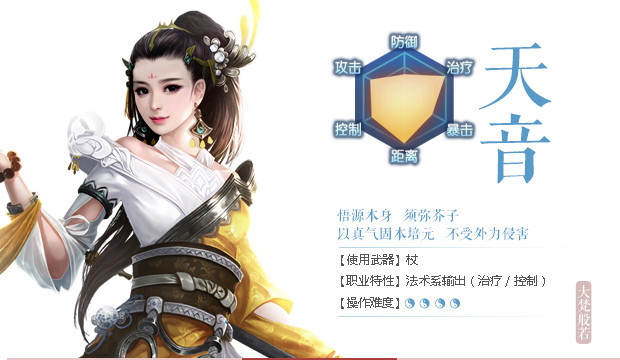 修炼大梵般若的天音,慈悲为怀,气质似已超然世外。天音寺持杖修行,技能多为法术系治疗,以防守见长,招式如佛光普照,可以救济世人,恢复气血。第三重“佛陀”开启后,可修习“大梵般若”、“万象生佛”等技能,在给敌方以强大杀伤力的同时,也能给自己和队友持续的治疗效果,似渡众生于万劫。
