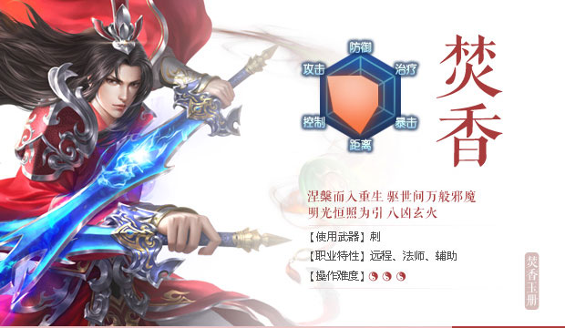 【焚香】焚香谷乃法术系职业,手持刺,擅长使用火系法术发动远程攻击。造成大范围AOE伤害,一击既出,足以令天地色变。在团队作战中,焚香绝无仅有的控制技能和独一无二的阵法还将起到重要的辅助作用。