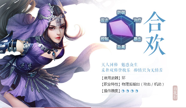神秘莫测的合欢,紫袂翩然,魅惑众生。合欢属物理系输出,单体强力输出,同时也有魅惑敌人的控制技能。合欢出手讲究“稳准狠”,功法大多迅速快捷,诡异多端,一旦出手,绝不留情,擅长在无形之中取人性命。
