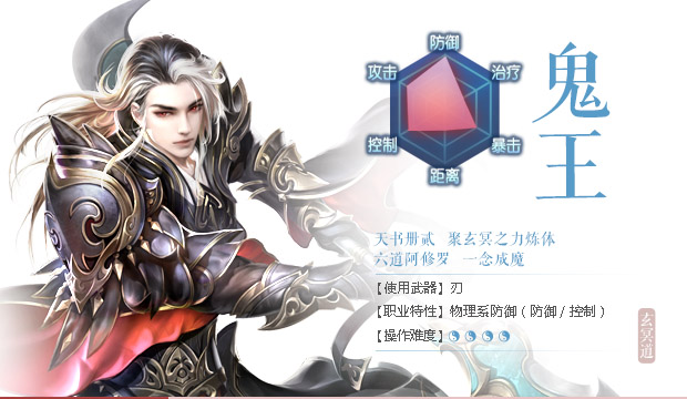 鬼王宗暗藏修罗之力,行事诡谲,造型霸气横生,一柄大刀似能横扫天下。鬼王属于坦克型职业,同时具备击晕目标的控制技能,吸收了西域修罗界的咒法化为己用,还可以召唤天魔元神附体使自身实力大增。50级时可修炼至第三重“邪冥”,所包含的“猛火咒”等技能,不仅能祭出元神提高自己的防御,更可造成大范围伤害,可谓刀如燃烈焰,所向披靡。