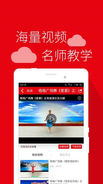 【名师名队】与云裳、美久、艺莞儿、索洁等广场舞领域顶尖名师及数百支知名舞队签约,为广大广场舞爱好者提供优质的教学内容;【海量视频】在这里,有海量的视频资源供您选择,分类清晰,无论您是入门还是资深舞者,无论您是队员还是领队或老师,这里都能找到您之所需;