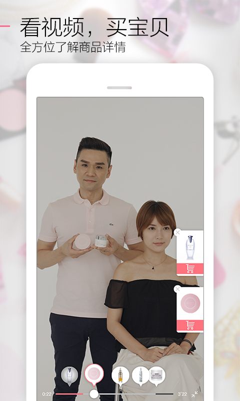 视频全屏状态下,将以气泡的形式将视频出现的商品展示给用户,方便用户一遍观看一边购买心仪商品。