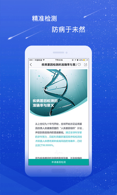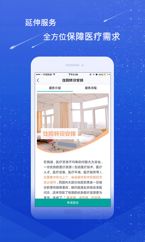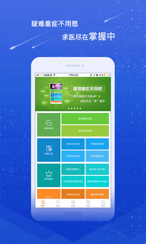 本产品以“呵护大众健康、共享优势资源、保障对症治疗、促进人文关怀”为宗旨,参照美国哈佛互联网全球诊疗系统,运用互联网科技,针对疑难重症和需求热点,整合国内外优势的医疗资源,建立“求医问诊、基因检测、前沿医疗、延伸服务”四大医疗服务板块,向社会大众推出“寻找医生专家、优势专科推广、专家远程诊询、专家直通问诊、疾病基因检测、肿瘤医学检测、泰国试管婴儿、日本重离子治癌、香港HPV疫苗、新加坡可溶解心脏支架、家庭医疗顾问、住院转诊安排”等极具市场需求的医疗服务项目,打造国内领先的融线上、线下服务为一体的创新型医疗服务体系。