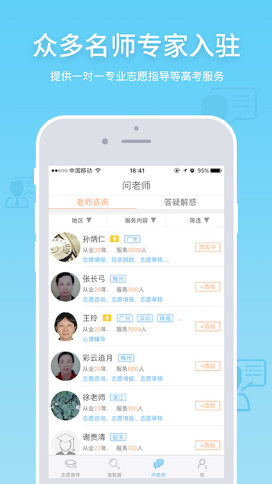3、问老师-便捷咨询。针对高考志愿填报时间短、决策难,优化志愿填报流程,充分运用移动互联网的优势,以志愿表+留言的全新咨询方式,搭建志愿填报网上快捷咨询通道,提高志愿咨询效率与准确性,简化志愿指导流程,降低交流障碍与指导风险,特别是班主任老师指导志愿的好帮手。