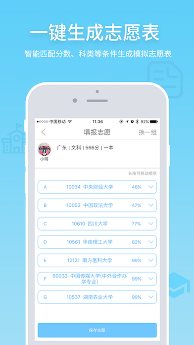 2、志愿推荐-科学分析与智能推荐。分析多年录取数据,采用独立开发的大数据算法,依据高考成绩、排位、招录计划等参数计算分数含金量及报考某大学的录取概率,智能推荐大学与专业(可按地域、专业筛选),生成多套志愿填报方案,出具科学性分析报告,授人以渔,让高考志愿报考胸有成竹。