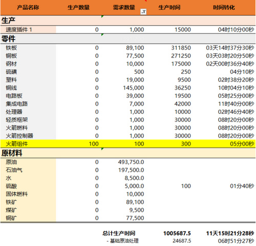 这个纯excel的小工具是用来计算材料需求量的。比如说计算发射一个火箭需要多少材料,在界面输入100火箭组件