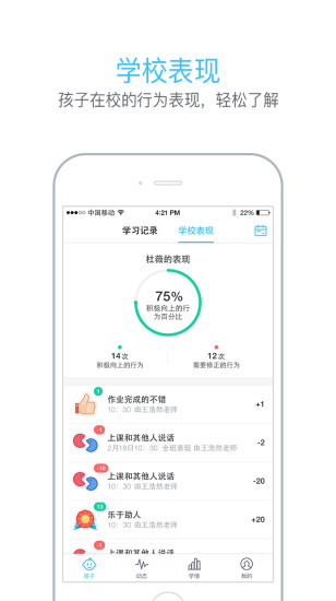 1.孩子表现:查看孩子的学习记录以及老师对孩子在校表现的评价,关注孩子成长的全面成长;2.班群动态:及时接收老师发布的孩子班级内的动态,还可跟老师家长互动,不错过孩子在校期间的新鲜事儿;