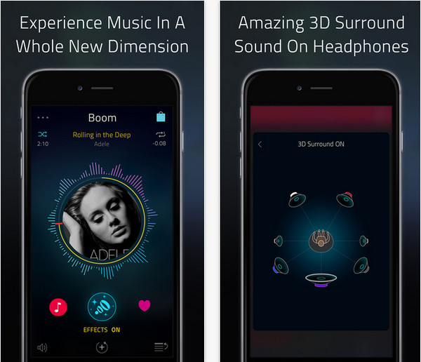 Boom app同样也以提高 iPhone 系设备音频质量为目标,应用包括 3D 环绕立体声,提供 21 种预设均衡器,从流行到重低音应有尽有,可以手动调整音效强度,依靠软件将本地歌曲全部高音质化,并支持使用简单的滑动手势自定义播放列表。