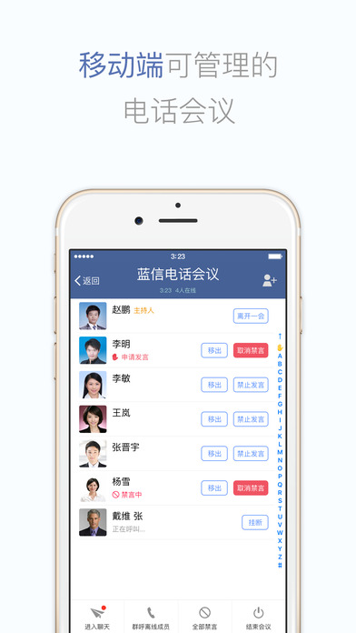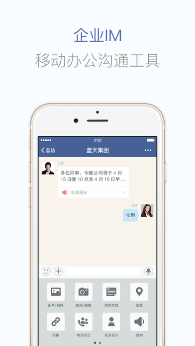 蓝信手机版支持公有云服务、私有云部署、独立部署,面向中大型和超大型组织提供基于组织通讯录的即时消息、名片库、工作群、文档云盘、电话会议、广播通知、图文公告、会议管理、考勤管理、绩效考核、数据上报统计、外部联系人管理、系统对接等功能和应用,致力于打造移动工作统一入口,打通组织边界,