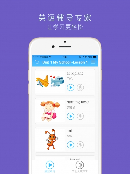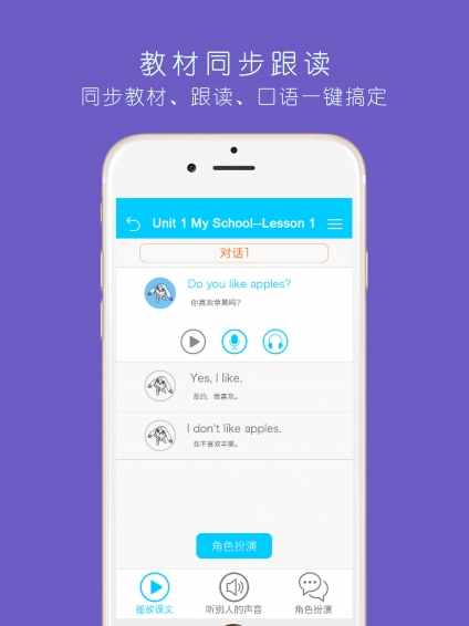 涵盖人教新起点、外研新标准、人教PEP、剑桥考试等多种主流教材中的所有英文对话和单词,课后跟读,随时随地。