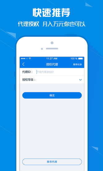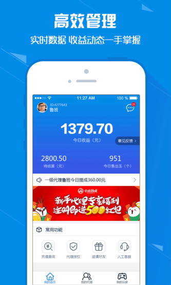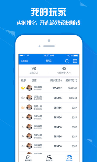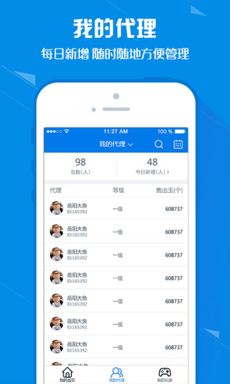 代理商可以通过下载客户端,登录个人帐号,实时掌握代理收益情况,快速进行代理授权以及玩家邀请,了解下级团队新动态。根据实时变化,更好的进行团队管理、预防与规避团队的不良发展,让代理管理更轻松高效。【软件特色】