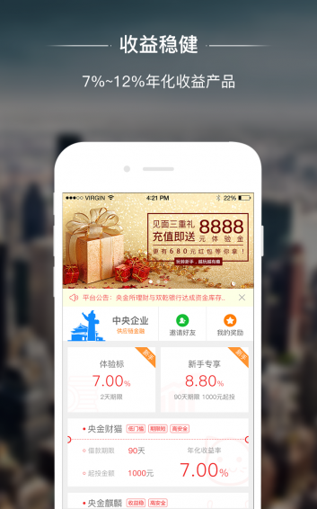 央金所给新用户送福利啦!见面礼:充值即送8888体验金+868投资礼包。1、便捷式高收益安全理财:产品收益在7%-12%,是银行的20倍,余额宝的5倍。