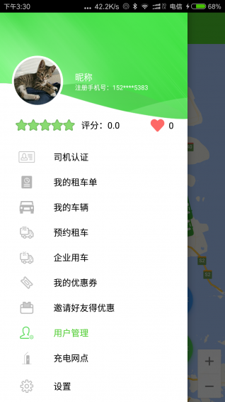租车:司机在地图上选择自己所需车辆进行分时租赁,系统安装司机租赁的时间进行费用计算
