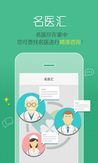 名医汇,由全国重点医院重点科室重点精英专家组成,名医专家通过掌上名医生平台了解用户健康信息,为用户提供网络、电话、面对面的精准咨询服务;主任医师团,由全国各级医院副主任医师以上医生组成,用户在app内发起免费咨询提问,专家依据擅长专业回复用户提出的问题,百分百专家本人为您提供专业权威解答;