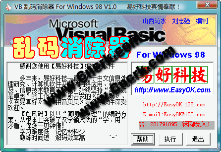 VB乱码消除器 V1.0 简体中文绿色免费版 目前,许多学校在教学VB6 编程时,还使用的是Windows98系统。在Windows98中,VB6的某些对话框总是不能正常显示汉字。其实许多人都遇到过这个问题,但一直没有根本性的解决办法。几经周转,并经多次测试,我终于顺利地解决了这个问题,多年的苦恼一扫而光为方便起见,我将整个修改过程编成这样一个《VB乱码消除器》的小程序,免费提供给广大学VB、用VB的朋友们使用。欢迎各位朋友将试用中所发现的问题反馈给我,谢谢!