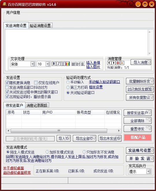 发送方式二:利用阿里巴巴中国站号、阿里巴巴国际站号发送,选择陌生人模式,直接给陌生人发信息。每个阿里巴巴中国站、阿里巴巴国际站白号每天可以发50-100条陌生人信息,第二天还可以继续发,百分百阿里巴巴营销软件中选择陌生人模式,设置批量自动登录阿里巴巴号,这样就可以实现全自动发信息。