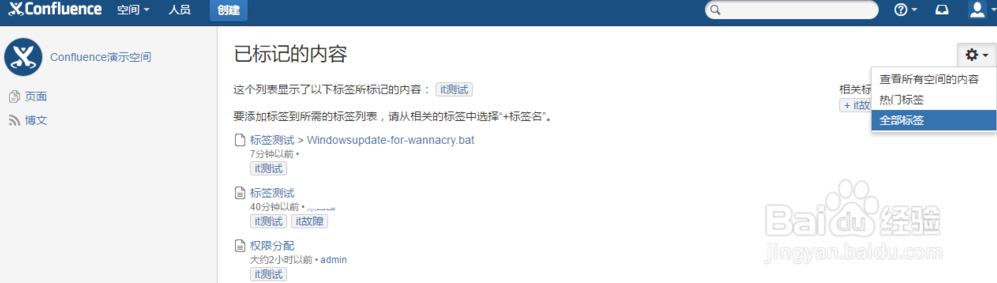 点击空间中的“查看标签”页面查看空间中的全部标签, 点击任一标签查看具有该标签的页面,并且可以进一步点击标签以得到满意的结果