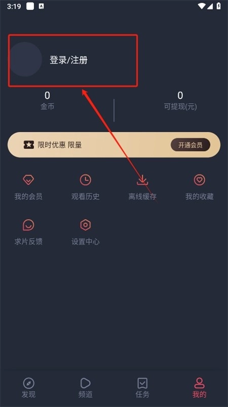 2、接下来打开软件,进入首页,在“我的”页面上方点击“登录/注册”。