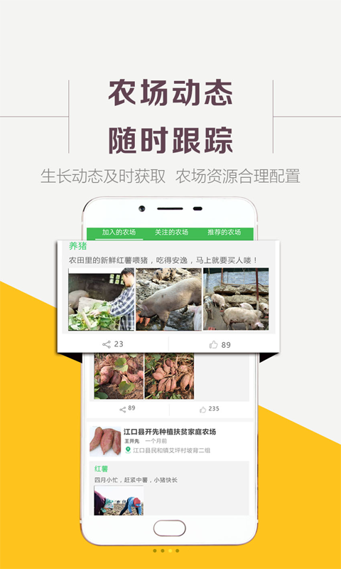 农场:全方位立体还原农场生产场景,提升农产品市场竞争力动态:随时随地了解农场动态,打造专属的农业社交圈子