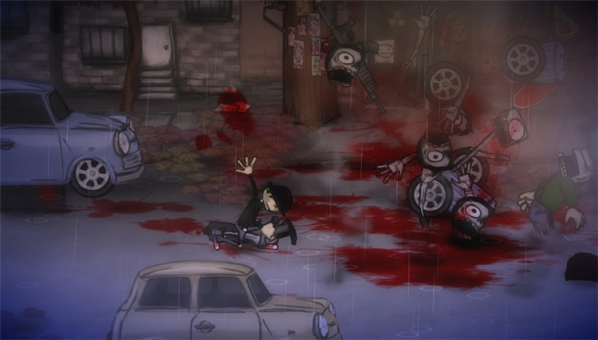 《查理谋杀者》在画面表现上就是有着与众不同的风格,阴暗色系的背景中显得人物物品的色系非常明亮,红色鲜血则像是战场上的玫瑰般与之形成一种强烈对比,如此冲突的视觉效果营造出来的气氛并不会感到难受,反而有另一种在异世界的氛围,在人物的刻画上就是游戏公司自家的水墨式画风为招牌。
