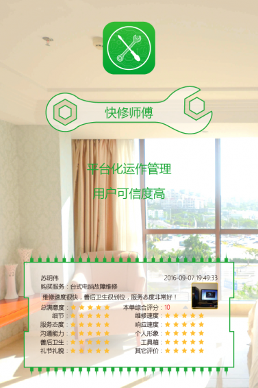 快修师傅,是一个拥有丰富维修资源的平台。对维修工程师来说一个拥有无尽财富可能的平台。快修师傅能让您自由安排、合理利用自己的空闲时间,随时随地抢单服务。只要您愿意,时间就是金钱。