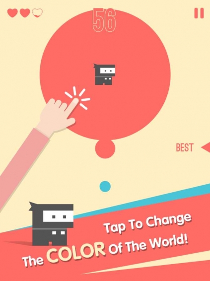 游戏以简单的红蓝绿三色构成整个画面,同时也是游戏内的主要元素。游戏的玩法虽然看似简单的“左右左”的分类游戏,但其实会更复杂一点。首先玩家需要根据下方不断上升的颜色图来进行左右操作,红色出现就要按住红色按钮,如果是绿色则可以直接都不按,否则也算操作失误。当蓝色颜色的图出现时,就要停止按红色按钮。每次按住的时候,从人物会扩散出相对颜色的色彩,直至覆盖整个屏幕,覆盖后如果出现另外的颜色,就要开始操作对应的颜色,或是停止操作。随着后期圆圈会逐渐变小,速度也会逐渐加快,所以左右操作会更加频繁,这也是游戏要得高分的难度。多练习几次掌握好每个圆圈上升的规律自然就会获得高分,另外,游戏有三颗心,每操作一次失误就会扣除一颗心,当三颗心都被扣除后就算游戏结束。
