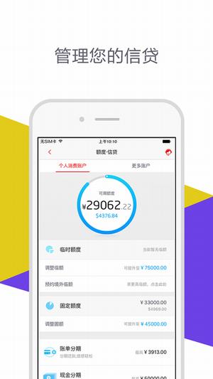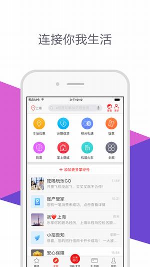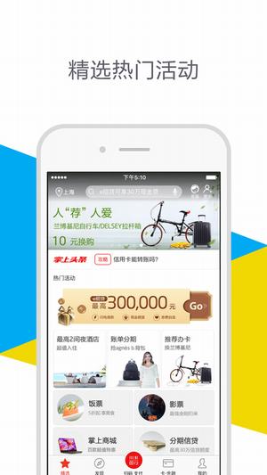 2、“发现”:分期理财、卡片精彩、饭票、影票、积分玩家、掌上商城、机酒火车、旅游海购……八大电商频道全程为您提供丰富优惠的商品