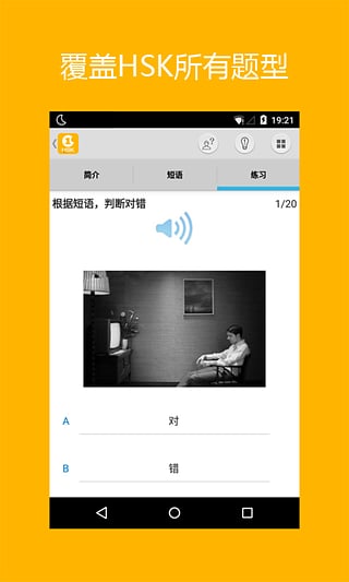 Hello HSK Level 1手机版是一款专业的汉语水平考试软件,软件考试训练主要分为听力和阅读理解两部分,并且都覆盖了HSK1会出现的所有题型、考试要点等,让你可以有针对性的学习要点、核心词汇、常用短语和解题思路,轻轻松松地通过考试。
