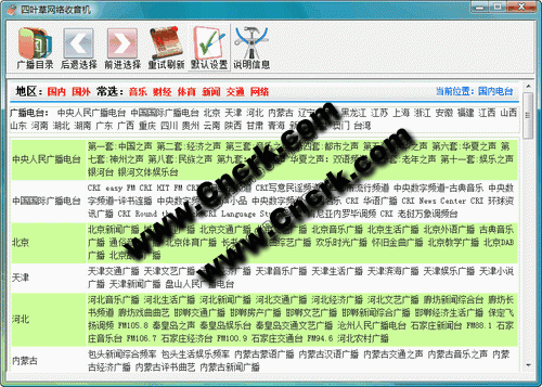 四叶草网络收音机是绿色、免费软件,下载直接使用,无须安装,内含多种特色功能,全天提供国内外在线收音,覆盖亚洲、美洲、欧洲、澳洲,涉及新闻、音乐、经济、娱乐、相声、教育、体育、交通等领域近千个网络电台频道。