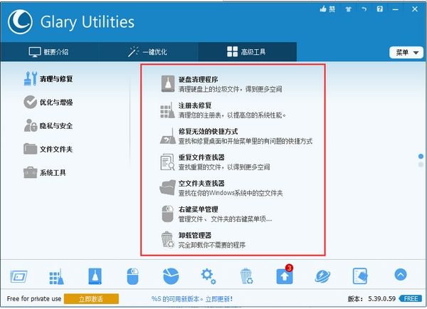 1、清理和修复磁盘清洁:从磁盘中删除垃圾数据并恢复磁盘空间注册表清理: 扫描并清理您的注册表,以提高系统的性能。修复无效快捷方式:更正您开始菜单及桌面上的快捷方式中的错误卸载管理器:完全卸载你不需要的程序