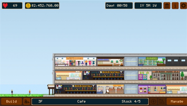 在《超市帝国(Mall Empire)》游戏中,你必须有计划的在大楼里放置设施,包括餐厅、商店、休息区、零售商店和电梯等等,为了增加商场的星级,你必须吸引更多的买家,提供更多的购买商店以及新的设施,从而使星级评级到五星级评级。