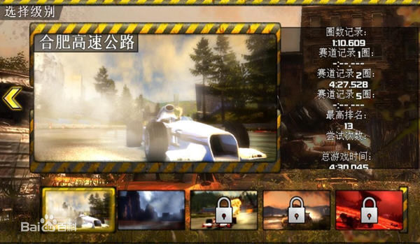 游戏有9种不同的模式,赛车,卡丁车,夜间等等。每个模式达到一定成就后解锁同一模式的下个关卡。思路不错但是关卡太少。对于真正的赛车爱好者来说挑战略显不足。很容易就可以把关卡刷完。