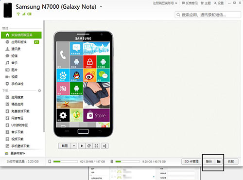 方法二:请点击豌豆荚右下角备份右边的「黑色文件夹」按钮,弹出的文件夹中便是您备份的数据文件。