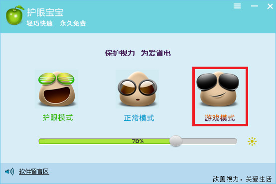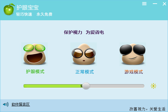 护眼宝宝是天翼工作室推出的一款轻巧快速、简单易用且永久免费的屏幕亮度调节软件。支持电脑保护色的设置,色彩调节后,重新载入软件整体进度条也会改变,支持设置快捷方式,更方便的调节屏幕亮度,既可以通过模式选择(护眼模式、正常模式、游戏模式),也可以通过滚动条自己调节屏幕亮度,非常方便.【软件特色】