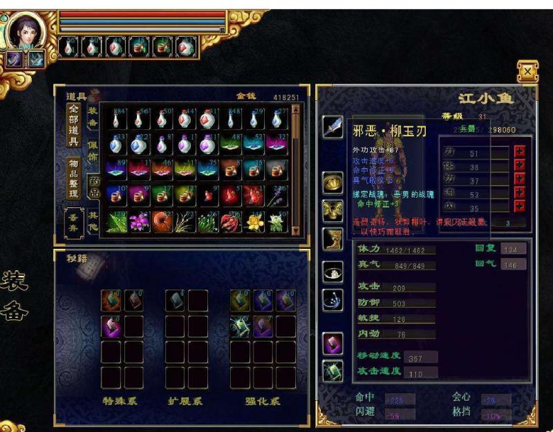 收集要素并非《鱼戏江湖》首创,可除了网游之外,似乎很少有单机游戏会设计出100种称号,虽然称号本身不具备任何属性和颜色的变化,可这种革新的意义远远大于名字的本身。为了满足玩家的收藏性,这款游戏处处都体现出可反复把玩的乐趣点,如何获得BOSS的特殊战魂,如何战胜必败的战役而获得新的殊荣,甚至连单机SL大法也成为了称号调侃的对象。而传承新绝系列的药品配置系统,也令老玩家倍感亲切。不得不承认,收藏系统的出现令《鱼戏江湖》从纯粹的单机完成了向多元化的转型。