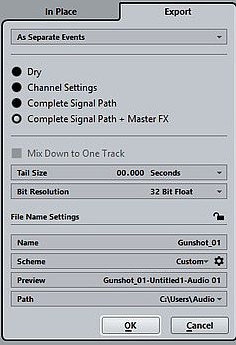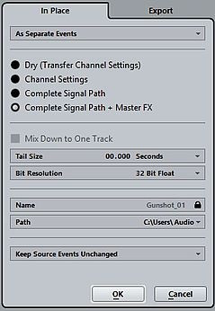 Render Export功能可以导出音频和midi文件中任意选择的部分并保存成单独的事件、block事件或文件。您可以选择在渲染过程中保留或省略哪些内容,比如,可以导出一个没有插入效果器的文件,也可以导出包括所有通道设置在内甚至包含主通道的完整信号路径的文件。