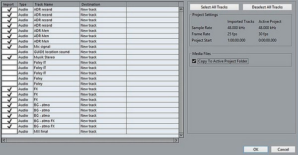 音频轨道的交换,包括在多个Nuendo工程之间的音频文件和数据的交换