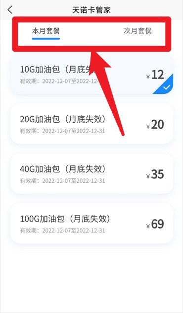 4. 在套餐管理板块,用户能够查看本月及次月的套餐内容,便捷选购各类流量加油包。