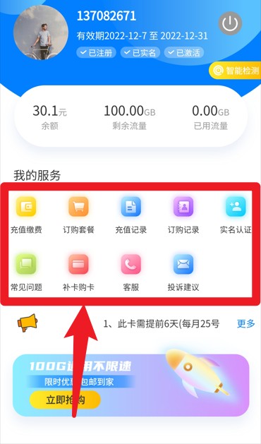 4. 无论何时,只需打开手机,就能查看自己的网卡信息,还能了解所购买的套餐详情。