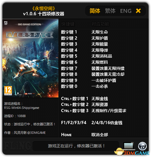 永恒空间修改器是专为《永恒空间》玩家准备的是十四项游戏修改工具。该工具由3dm风灵月影大神制作。拥有无限生命、无限护盾、无限能量等多项功能,支持最新游戏版本。