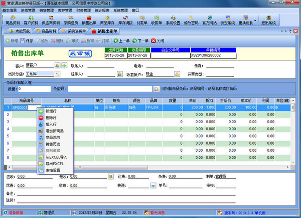 基本功能:进货入库、进货退回、销售出库、销售退货、报损、报溢、分库调拨(支持异价调拨)、拆零、组装、盘点、收款、付 款、预收、预付、收入、支出、成本、利润核算等。【软件特色】