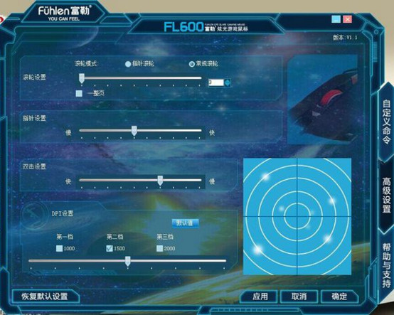 驱动界面总共分自定义命令、高级设置和帮助与支持,三部分。